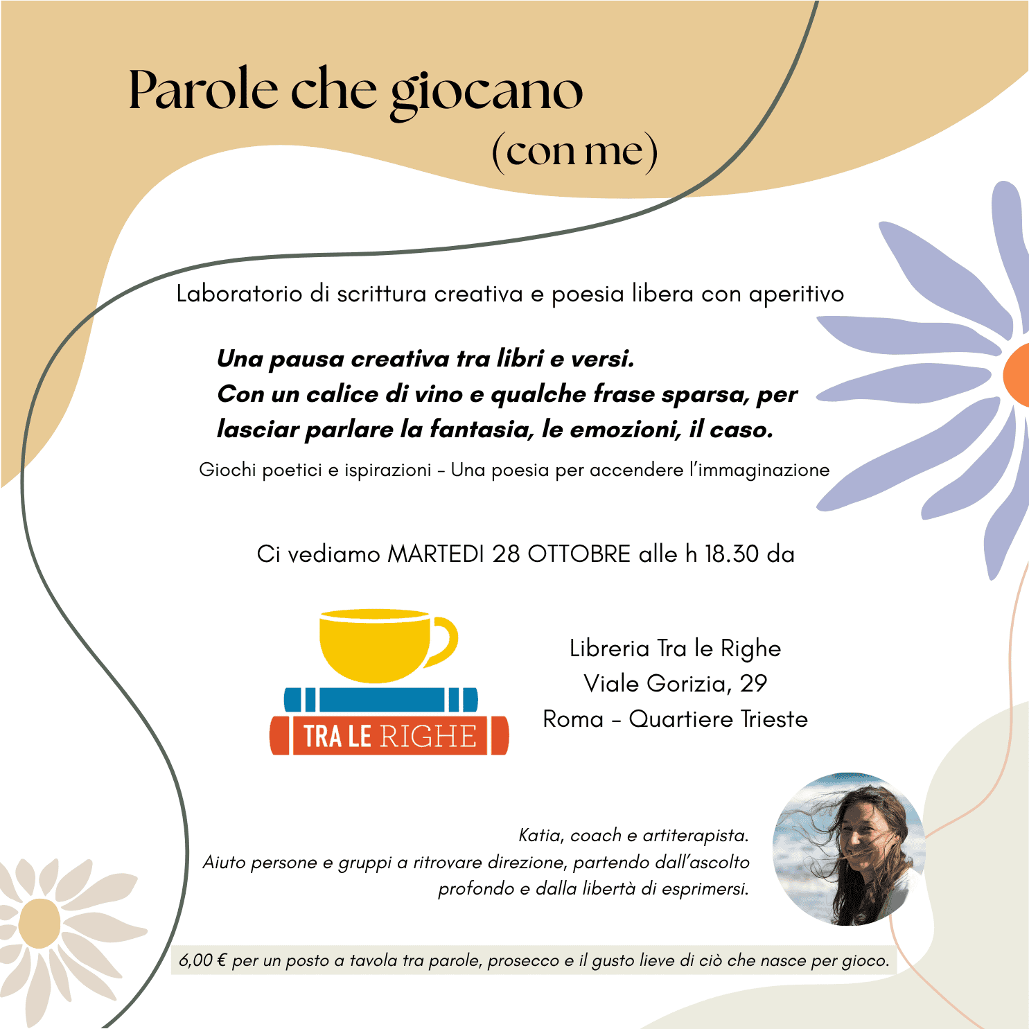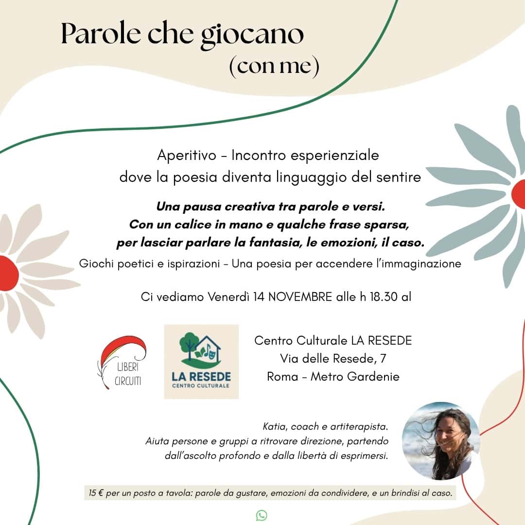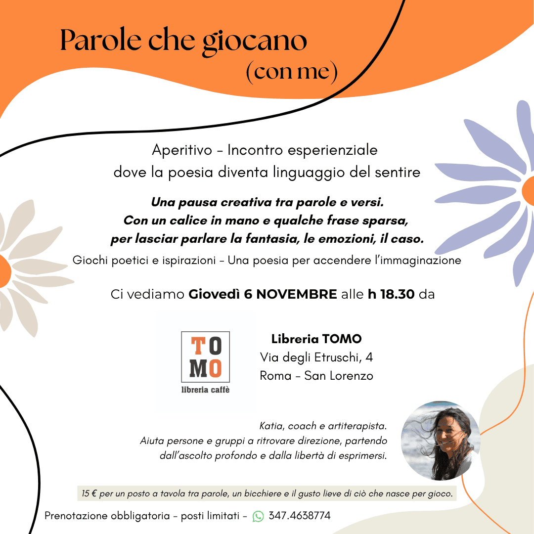 Un laboratorio di scrittura creativa e poesia libera per esplorarsi con leggerezza. Non serve essere poeti. Non serve avere idee. Serve solo curiosità e un po’ di voglia di giocare con le parole. Dietro il gioco, la scoperta autentica. Ci vediamo Martedi 28 Ottobre alle 18.30 presso la Libreria - Tra le Righe - Viale...